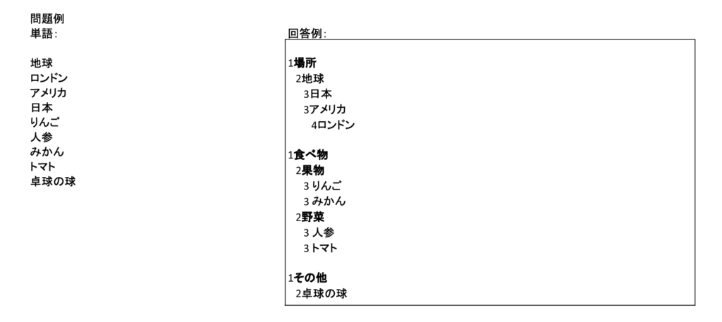 例のように、単語を適した位置へ分類分けしなさい(分け方は自由です)