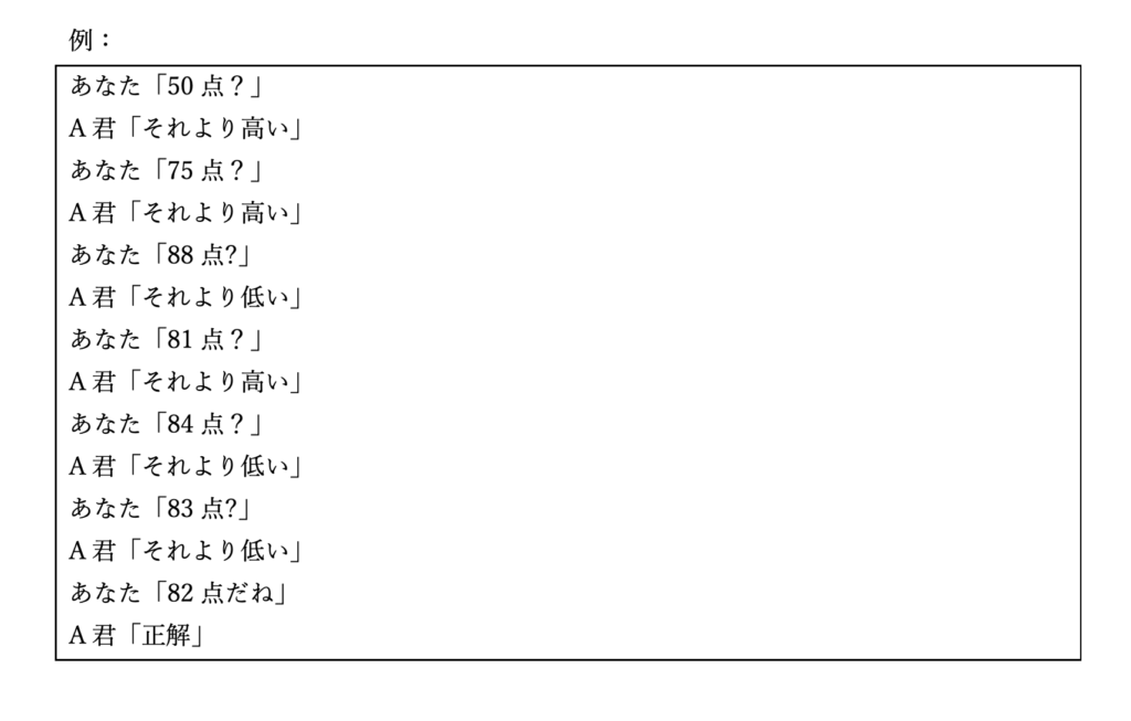 確率は考えない場合、常に点数の範囲の中央値で質問していくと、効率よく A 君の点数を当てることができます。